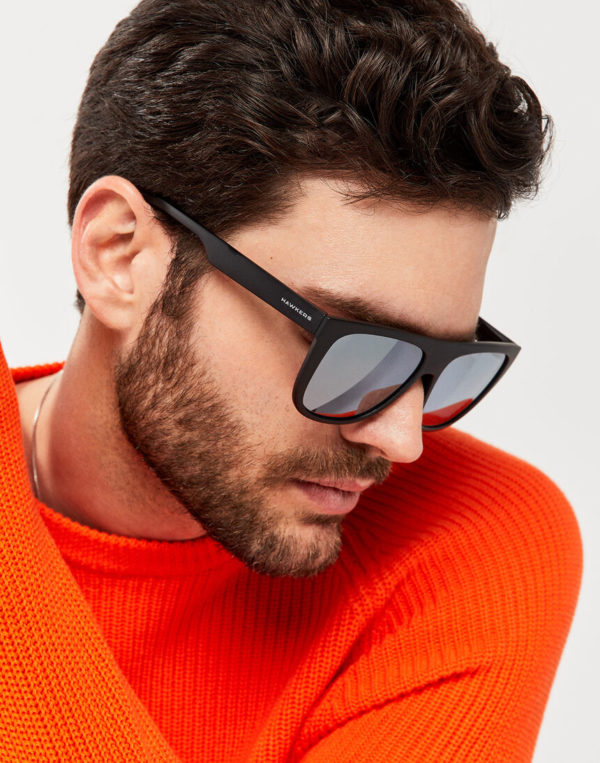 Lunettes de soleil catégorie 3 avec monture noire au fini mat et verres miroir argentés avec protection UV400%. L’élégant pont semi-rectiligne contraste avec les lignes arrondies pour donner un caractère subtilement agressif à ce modèle.