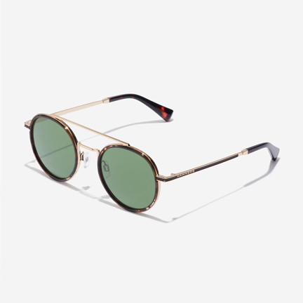 Ce design arrondi est essentiellement caractérisé par la classique combinaison des verres verts bouteille avec des cercles en imprimé carey. La structure en métal doré, avec une barre frontale, un pont simple et des incrustations noires le long les branches, ajoute des détails éclatants.