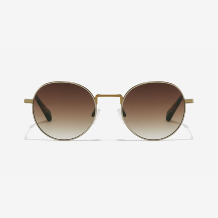 Monture en métal or mat avec des manchons en imprimé havane et des verres marron à effet dégradé.