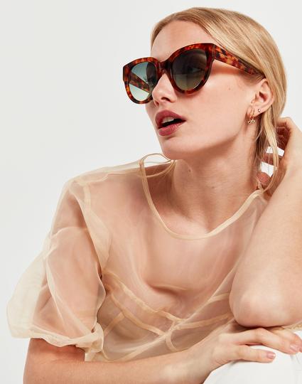 Nous avons récupéré les codes des années 70 avec ce design soft cat eye en acétate poli en imprimé havane. Sa partie frontale surdimensionnée et ses branches bold triangulaires stylisent sa silhouette féminine et sophistiqué. Les verres verts dégradés rehaussent son style rétro.